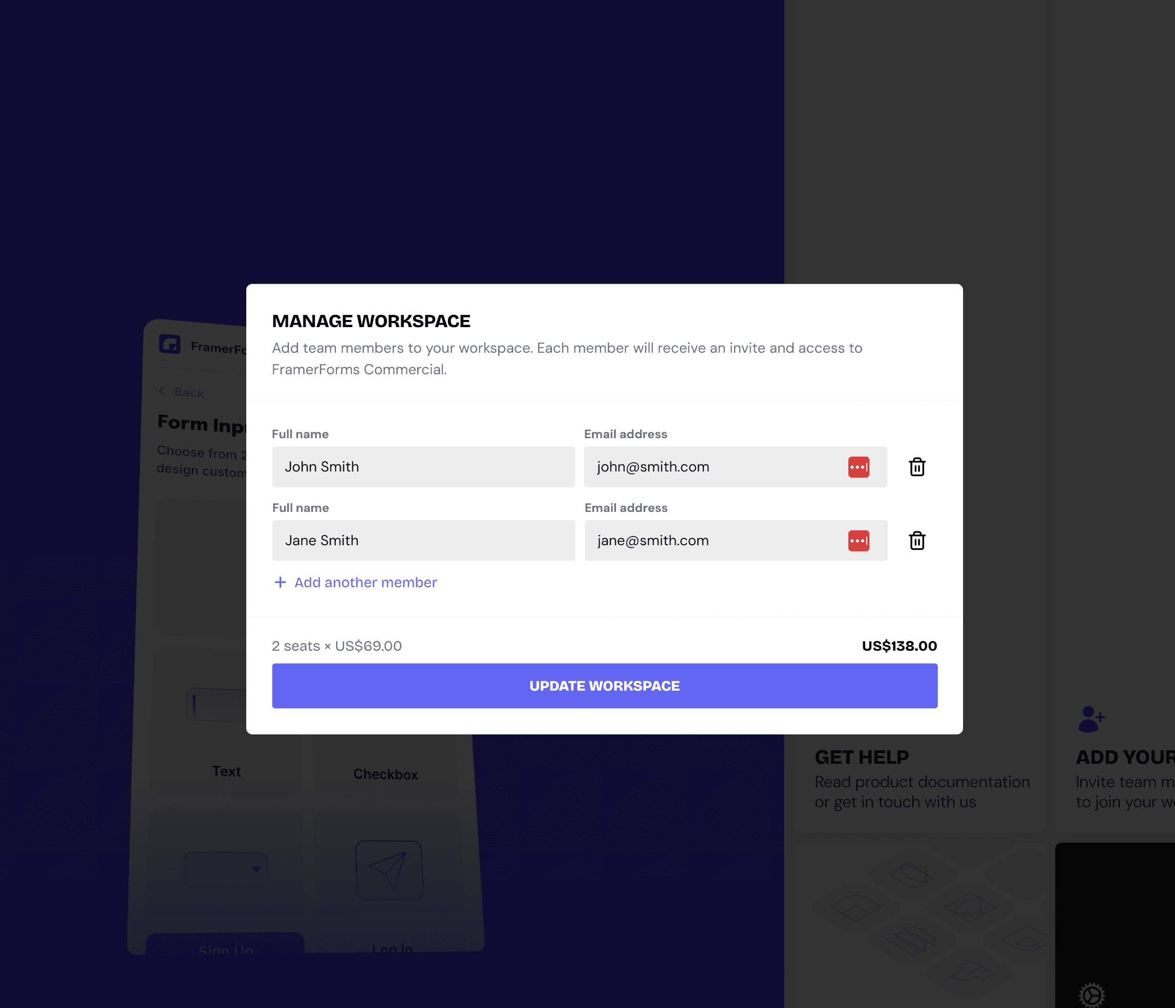Give your whole team access to FramerForms and collaborate using the most advanced and customizable inputs for your Framer forms.